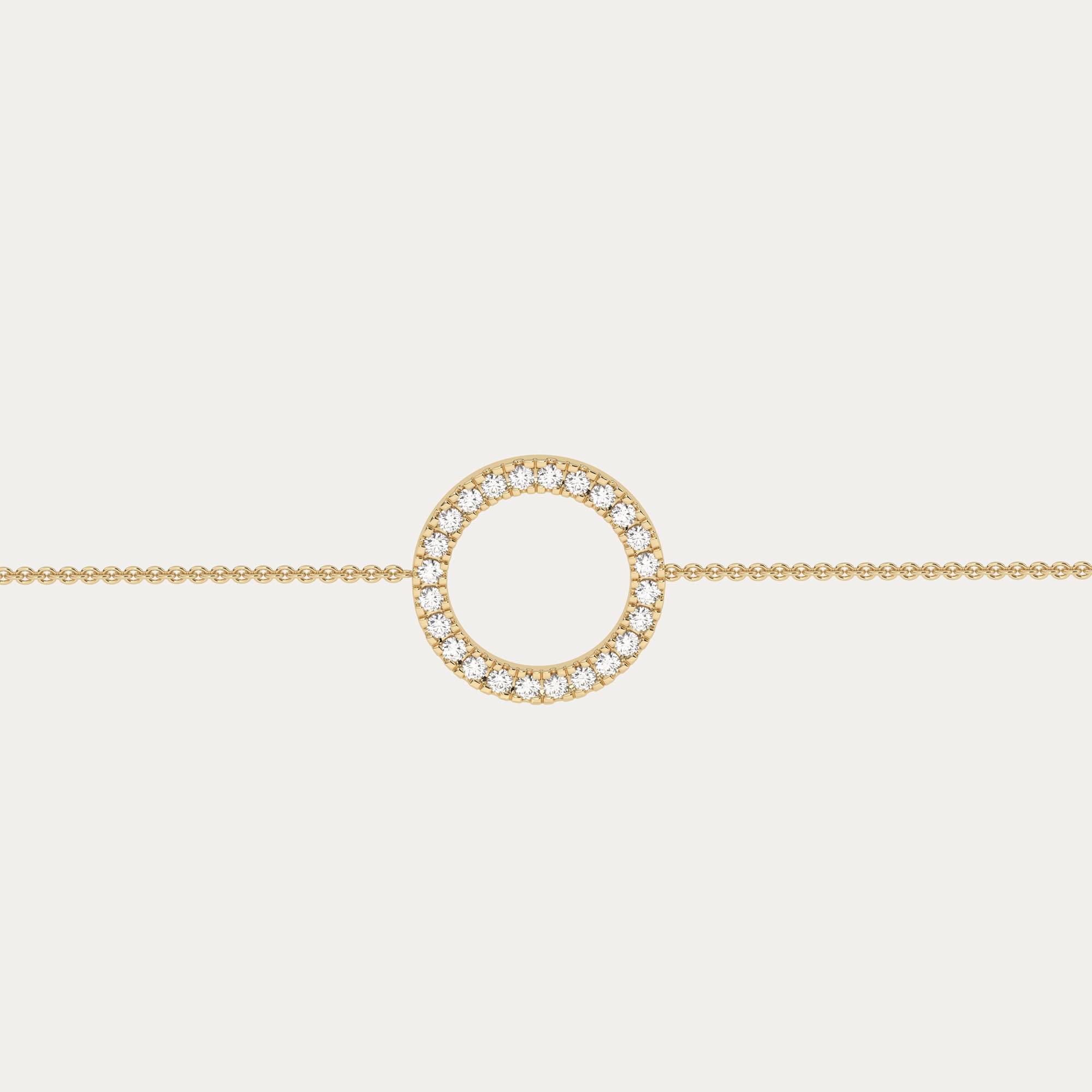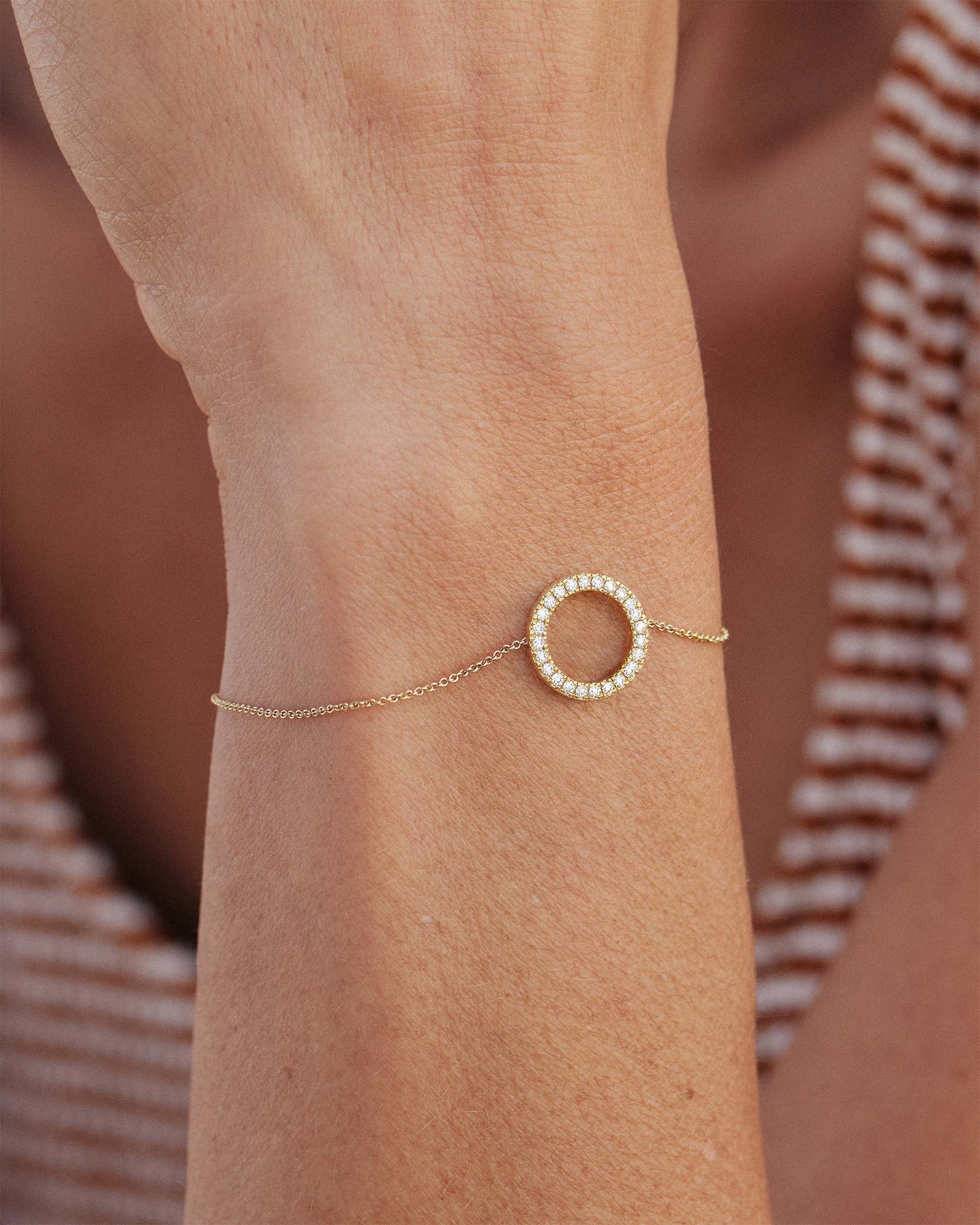 The Signature Circle III bracelet continues the collection’s core form, featuring a polished circular frame set on a fine gold chain and encircled with diamonds totalling approximately 0.24 carats.