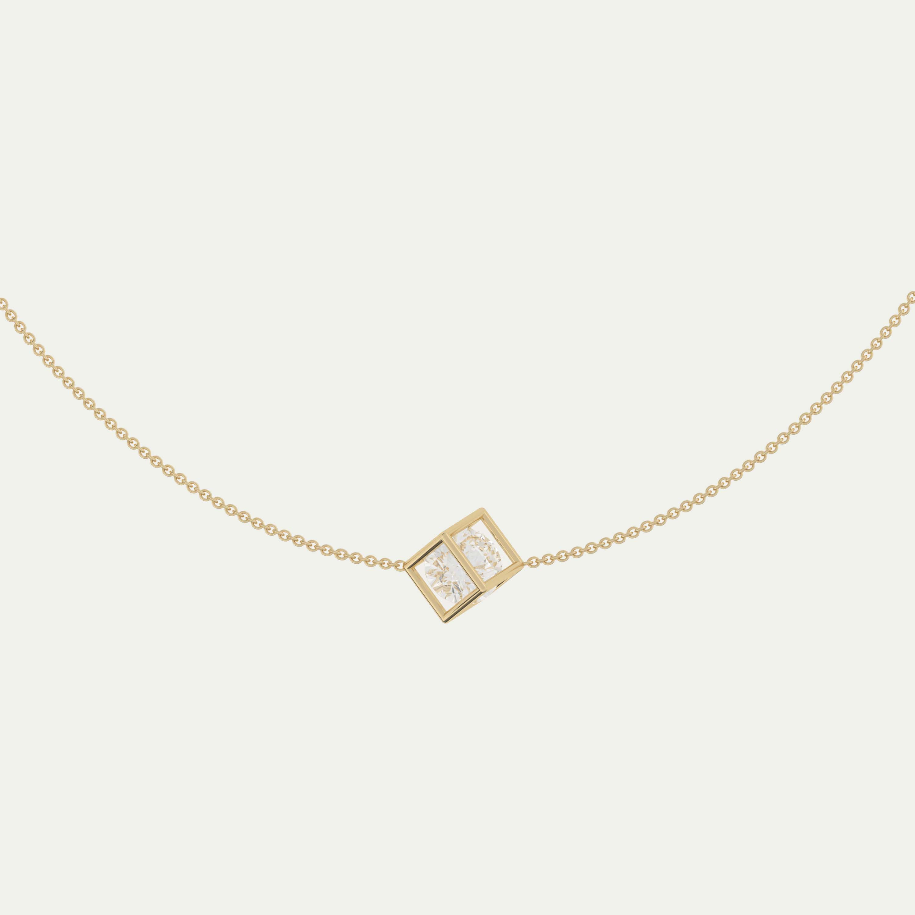 The Enframed Large Diamond necklace is the larger interpretation of the design, featuring an expanded gold frame and a more substantial stone. An approximately 1 carat diamond is held within the geometric structure, set on a fine gold chain and designed to allow it to move freely inside its frame.