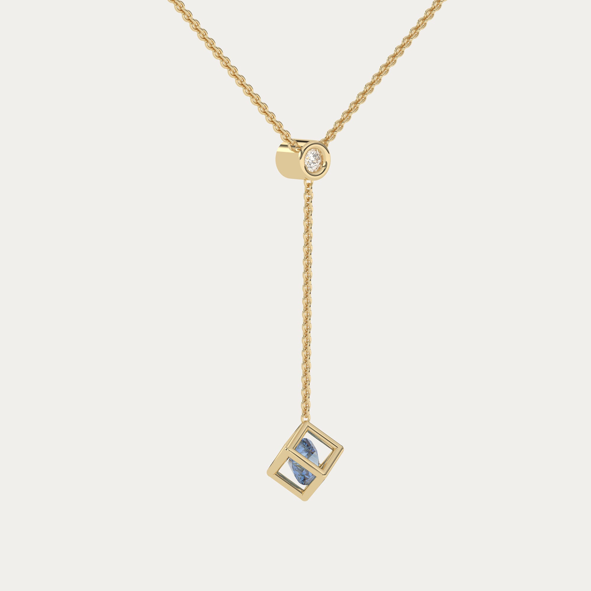 The Enframed Gemstone Lariat Necklace features a geometric gold frame holding a 4 mm gemstone, designed to move freely within its structure.