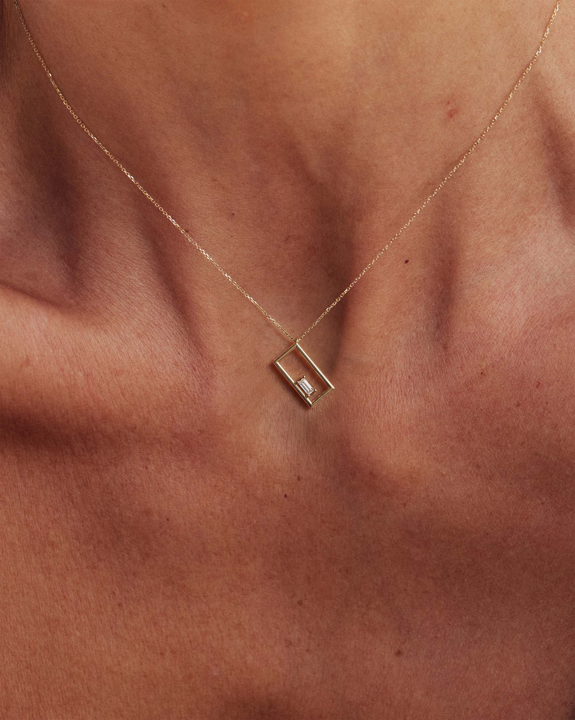 The Signature Rectangle II necklace introduces a subtle accent to the collection’s original rectangular form, featuring a single diamond of approximately 0.10 carat in a four-claw setting.