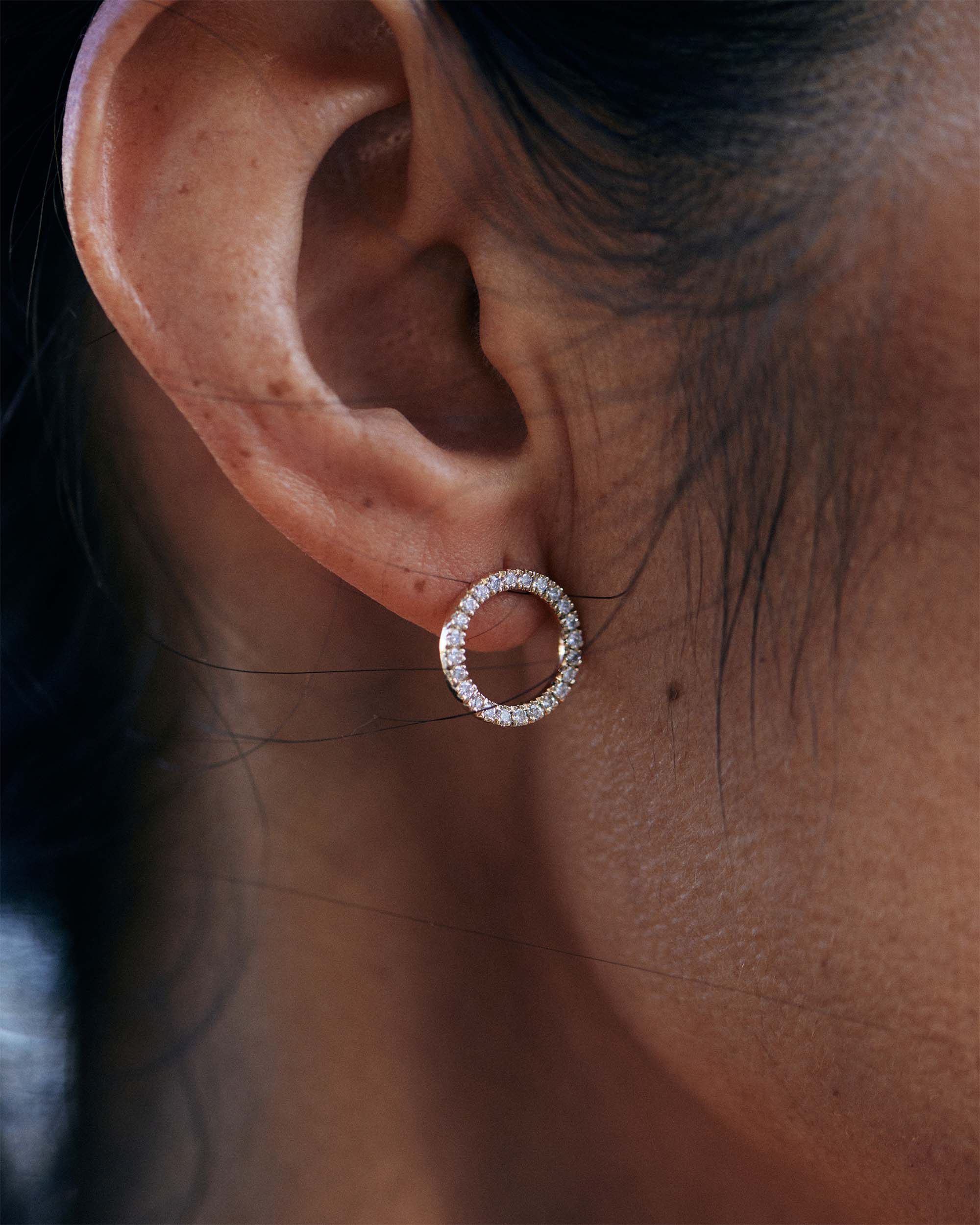 The Signature Circle II earrings build on the collection’s core form, featuring diamonds totalling approximately 0.5 carats, set along circular frames in polished gold.